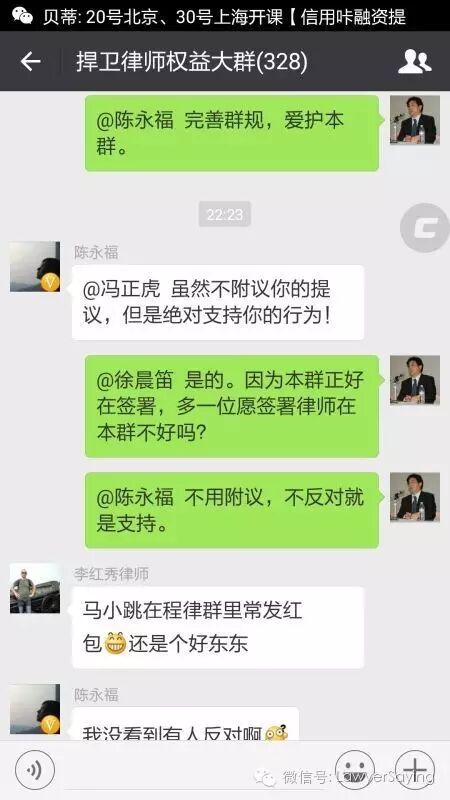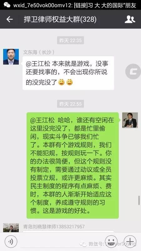 @冯正虎 这一点我同意,微信群作为一个社交平台的普遍原则应该是合则来不合则去,但本群作为一个捍卫律师权益平台及民主实验群,有自己的成型规则,规则完善与否不论,本群并非来去自由之群,尤其是来,必须受到规则制约。