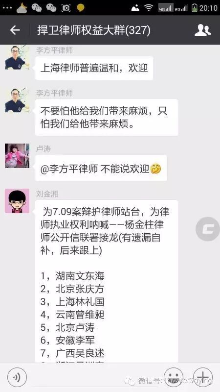 3,这个群名字响当当“捍卫”还“大群”,可是它真的名副其实吗?若真名副其实就不会无视我在杨金柱律师捍卫律师执业权利的公开信联署中积极参加又发动大家参加为群争光的苦劳,而拿我为弹劾仲裁员的不专业与只有口炮没有实际行动(指没参加联署)的那几个人的对决来说事,纵容粗鄙,压制死磕了。群友小小说活权益尚不能维护,谈何捍卫大大的律师权益?