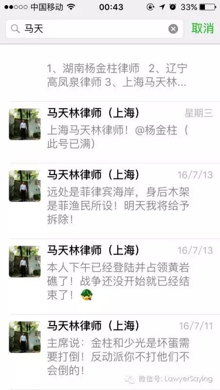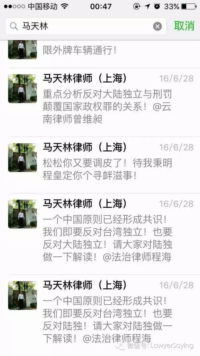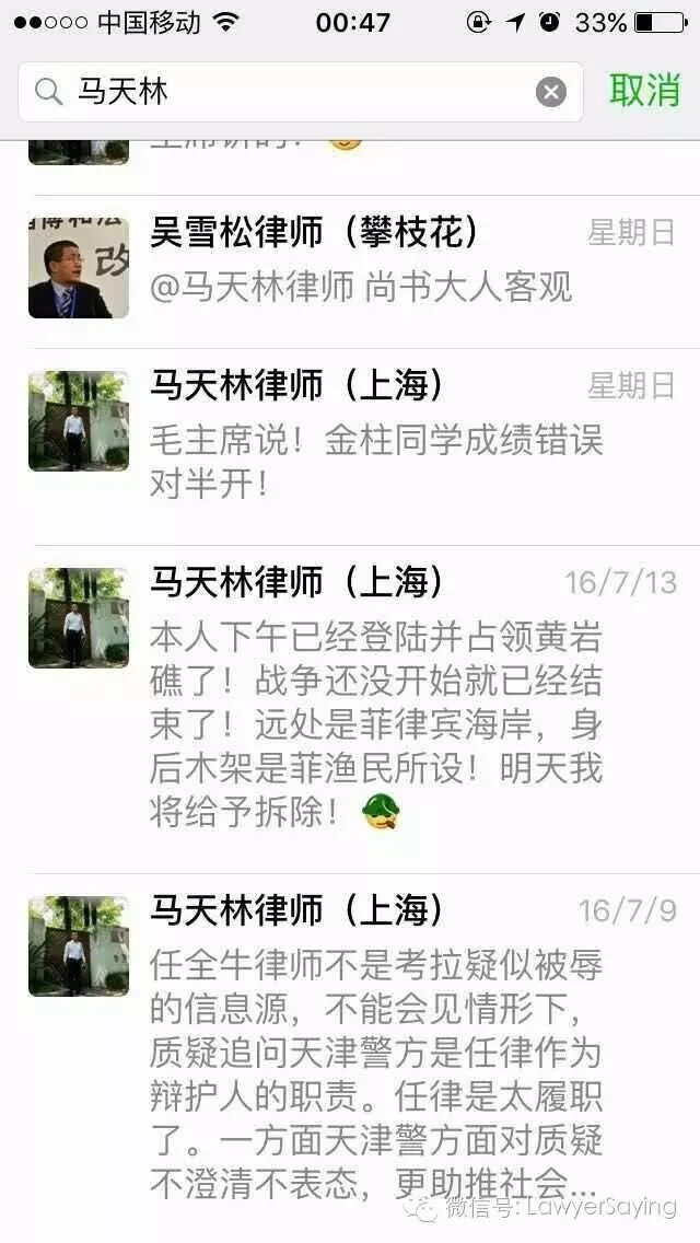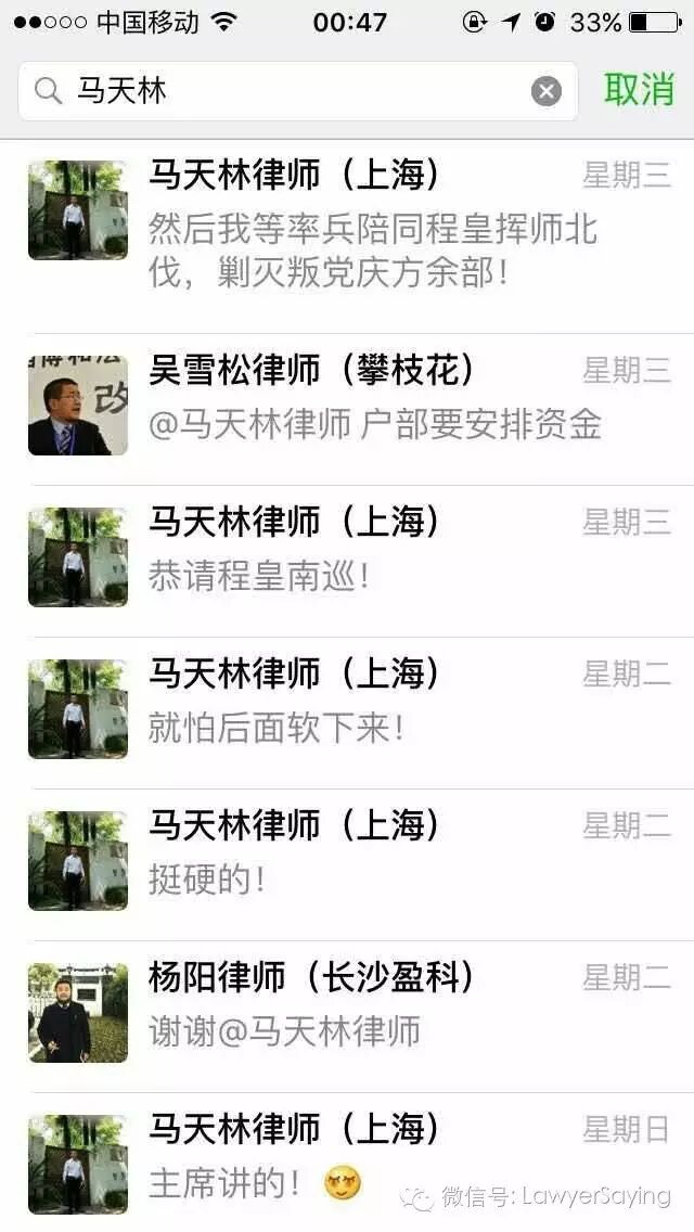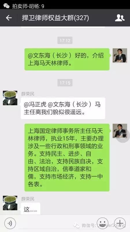 @徐晨笛 你可以坚持你的不同政治观点,马律师也可以坚持他的不同政治观点,但你们在捍卫律师权益这个基本点上共同的,而这个微信群就是捍卫律师权益的微信群。你们这些挺起脊梁敢于维护律师权益的律师不是多,而是太少了,应该团结更多的律师,携手共进。