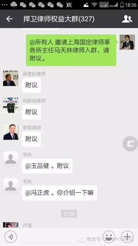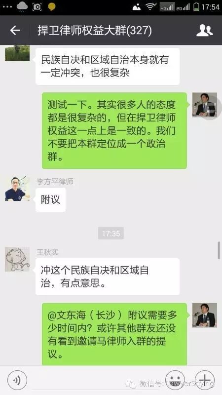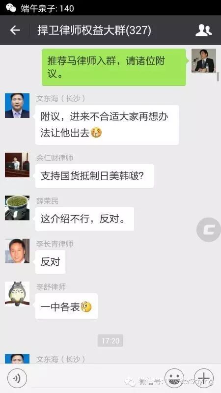 17:00许,冯正虎提议上海马天林律师入群。文东海等10人附议,李长青等2人反对。