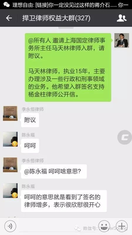 1,我们的马律师为什么执意要入群呢?难道不入这个群他就不能捍卫律师权益了吗?难道这个群三百多号律师人人都在捍卫律师权益方面小有成就吗?如果真这样,老杨那两封公开信的联署群里就不该只有不到四分之一的人署名了。