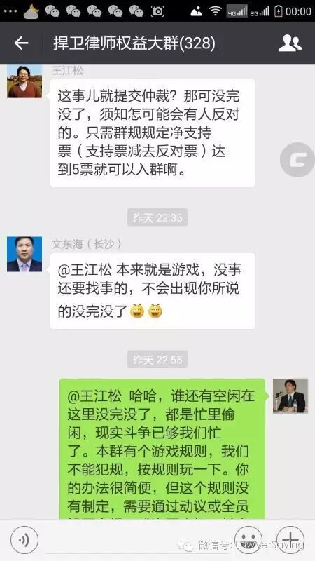 @薛荣民 哈哈,群规让我们自找麻烦了,从自以后就没有一个律师可以入群了,入群前只要有一张反对票,入群之后24小时内只要有3张反对票,在二百多人的群里要找几张反对票是很容易的,谁愿意这样内耗?